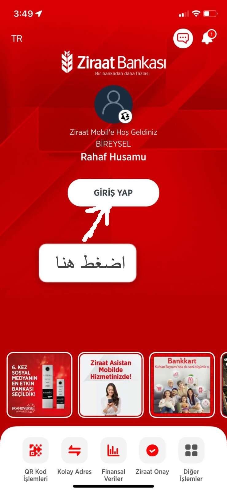 بعد تحميل تطبيق بنك الزراعات والضغط عليه ستظهر لكم صفحة بهذا الشكل لتقوموا بالنقر على كلمة “Giriş yap”