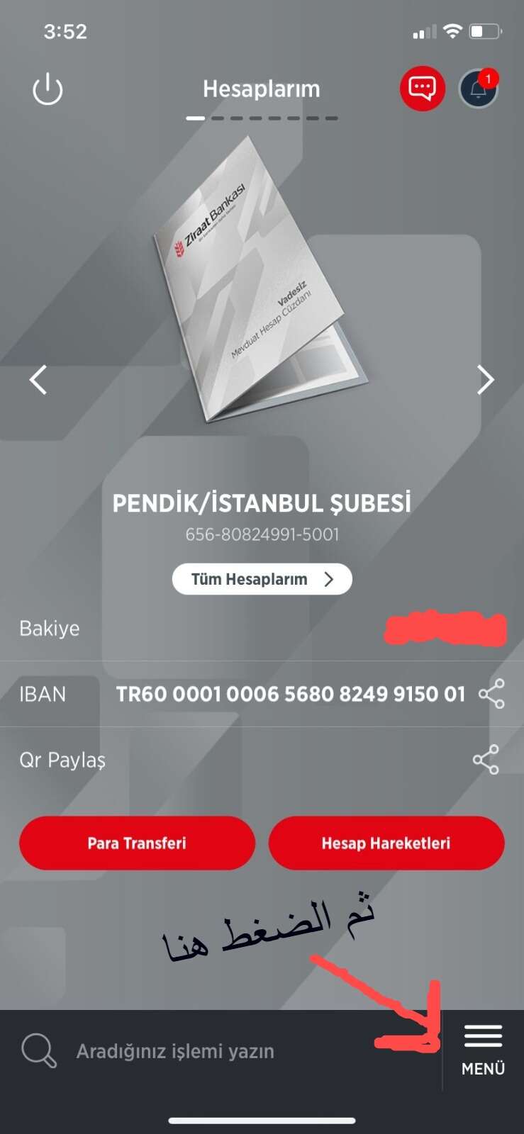 بعد ذلك يتم الدخول لحسابكم كما هو موضح في الصورة، ثم الضغط على زر “MENÜ” الموجود على اليمين أسفل الصفحة.