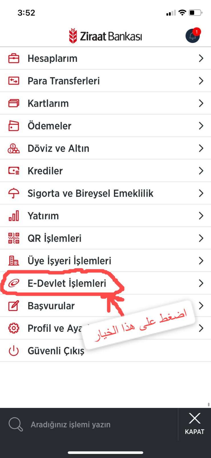 بعد ذلك ستظهر لكم خيارات الاي دولات المتوفرة في تطبيق بنك الزراعات، تقوموا بالضغط على الخيار الأول “E-Devlet”