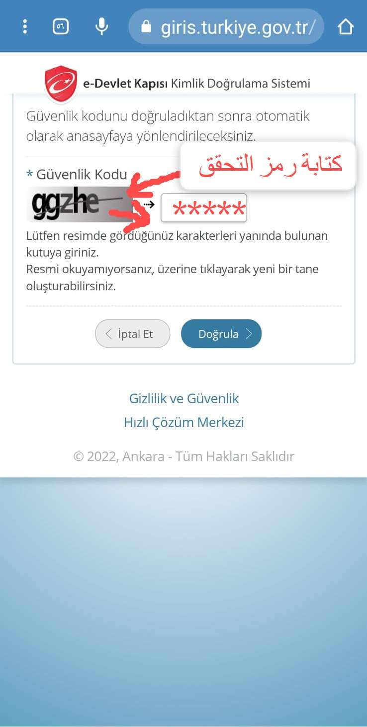 ثم ستفتح لكم صفحة ويب لكتابة رمز التحقق “Güvenlik kodu” بالشكل الصحيح كما هو مكتوب لكم، من ثمة الضغط على كلمة “Doğrula” باللون الأزرق اسفل الصفحة.