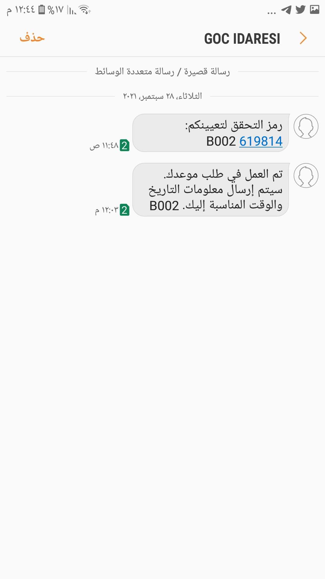 ثم ستصلك رسالة على هاتفك المحمول تفيد بأنه تم العمل في طلب موعدك وسيتم إرسال معلومات التاريخ والوقت المناسب إليك.