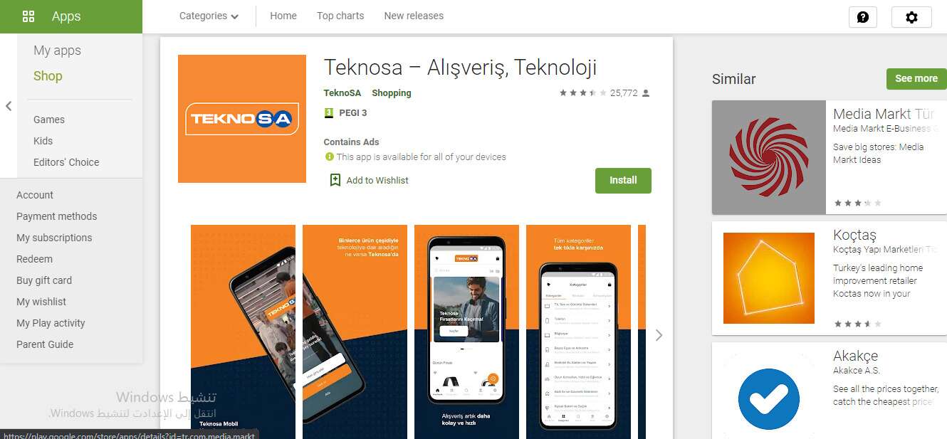 إحتل متجر وتطبيق Teknosa (تكنوسا) لشراء الاجهزة الكهربائية والالكترونية الصدارة وجاء في مقدمة التطبيقات واشهرها لبيع الاجهزة الكهربائية والالكترونية في تركيا.